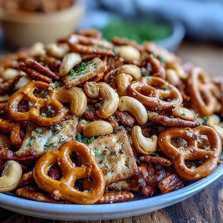 Pin it I was cleaning out my pantry one Saturday, staring at half-empty bags of pretzels and crackers, when I realized I could turn them into something actually exciting. I melted some butter, tossed in ranch seasoning and everything bagel spice, and the whole kitchen smelled like a deli counter. My husband wandered in, grabbed a handful straight off the baking sheet, and told me I'd just invented his new favorite thing. That's how this snack mix was born: out of leftover bits and a refusal to let anything go to waste.